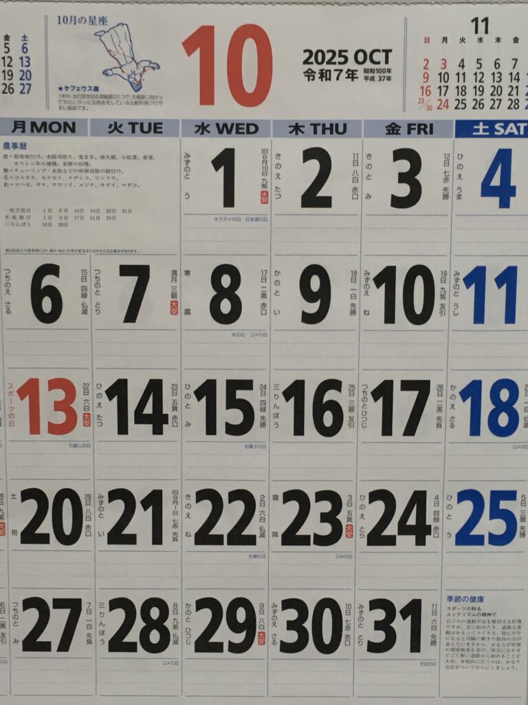 皆様常日頃誠にお疲れ様です。ここから未来内の大型カレンダーです。各日の項目の右下に大安、赤口、先勝、友引、先負、仏滅と記載されています。これらは、六曜といって、その日の吉凶を表す暦注の一種であり、手帳やカレンダーの大半に記載されています。私が覚えている限りでは、仏滅が最凶、先負が午前凶・午後吉、友引がやや凶、先勝が午前吉・午後凶、赤口が少々凶、大安が全面的に吉です。本文記入日10月22日は仏滅ですが、前日21日より朝食の時間が16分遅くなった以外にまだ凶事はないかと思います。仏滅とは言うものの、仏教とは無関係で、時刻の吉凶を占うための中国発祥の占術「六壬神課(中国の唐王朝時代にできたとされ、六壬と略すこともあります)」が日本に入った際に(室町時代とされますが、不明です)変化してできたものです。