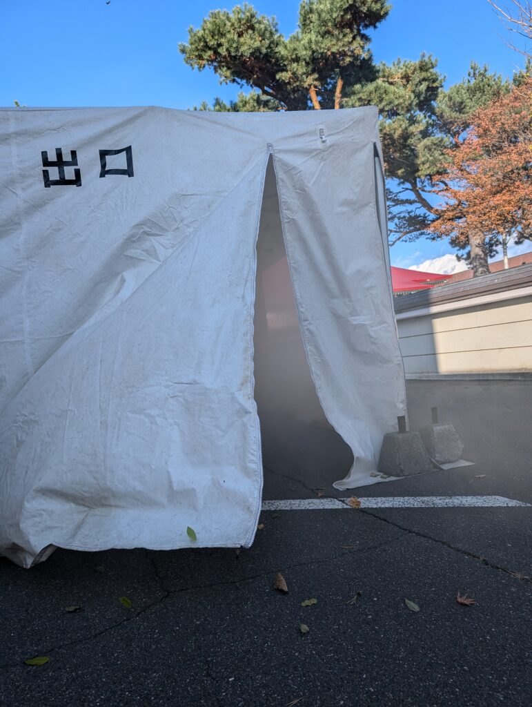 入ってみると中はけむりで充満しており、前がほとんど見えない感じでゆっくり歩かないと進むのが難しいと思いました。中の様子を撮影したかったのですが自分にはちょっと難しかったです。実際のけむりもこんな感じに見えにくくなってしまうのかという事を体験できました。