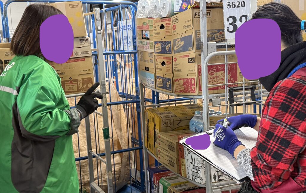 明日宅配する予定の商品の仕分け作業を体験させていただきました。数字が書いてあるカゴに同じ数字が記載されている商品をのせていきます。最後に場所と数が合っているか確認のため、職員の方と一緒にチェックを行いました。