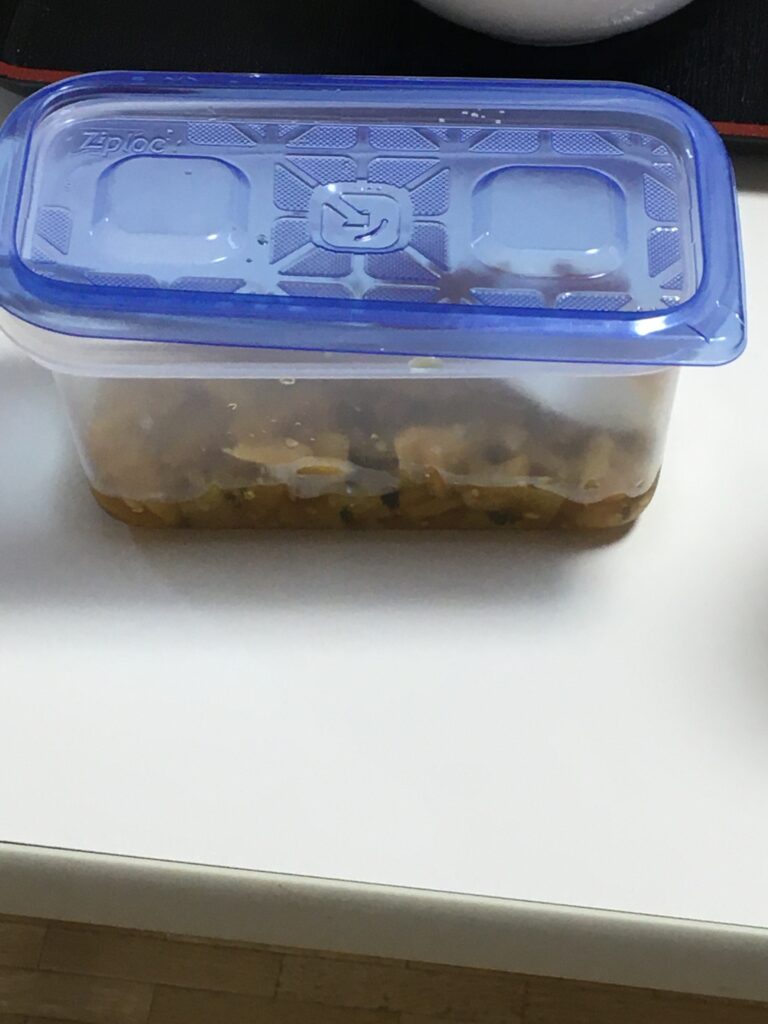 前回のコメの日で福神漬けのせ炊き込みご飯を掲載いたしました。その延長上で容器入り福神漬けの画像です。一般の福神漬けは赤色ですが、この福神漬けは沢庵漬けのような黄色です。ただ、材料に大根、紫蘇、時々胡瓜が入っており、味も福神漬けに近いので、福神漬けと確信しております。