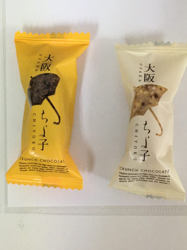 皆様常日頃誠にお疲れ様です。12月2日に某支援員が関係者各位に配った大阪土産のおこしクランチチョコレート「大阪ちよ子」の画像です。昼食時に美味しく頂きました。御覧の通り、アーモンド入りミルクチョコレートとレーズン入りホワイトチョコレートの2種類があり、大阪府のおこし製造・販売会社の老舗あみだ池大黒(1805年創業)が開発し、大阪・神戸・滋賀・奈良に展開しております。