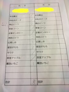 サイダーコンテナにはそれぞれの種類で入れる場所が決まっており、サイダーがなくなった場所を数えて種類と本数を用紙に記録する。
